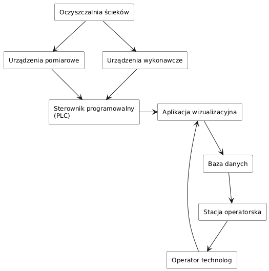 Oczyszczalnia ściekówUrządzenia pomiaroweUrządzenia wykonawczeSterownik programowalny(PLC)Aplikacja wizualizacyjnaBaza danychStacja operatorskaOperator technolog