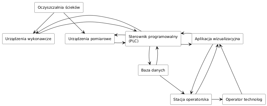 Strukturę systemu monitorowania produkcji w zakładzie, możemy podzielić na dwie główne części. Pierwszą z nich i najważniejszą jest SCADA. Termin ten odnosi się do systemu komputerowego i jest nadrzędnym elementem w całej strukturze. Drugim składnikiem systemu są zdalne urządzenia końcowe. Zbierają one informacje o stanie urządzeń technicznych poprzez pomiary wielkości ciągłych (np. natężenia prądu, prędkości przepływu płynu czy temperatury) oraz dyskretnych (o wartościach rozdzielnych, np. stan zaworu otwarty/zamknięty, pozycja przełącznika 1,2,…n) i transmitują je do centralnego systemu SCADA, a także przyjmują polecenia z systemu centralnego i według nich oddziałują na urządzenia (np. włączają i wyłączają, ustawiają zadane parametry pracy). Rolę RTU mogą pełnić uniwersalne sterowniki (PLC, ang. programmable logic controller) bądź dedykowane urządzenia, w tym modułowe (o konfiguracji sprzętowej dostosowywanej do potrzeb). Poza podstawowymi funkcjami RTU zbierania danych i przekazywania poleceń sterujących, mogą one pełnić rolę lokalnych sterowników lub zabezpieczeń, prowadząc automatyczny nadzór i sterowanie urządzeniami (np. wykrywanie nieprawidłowości w pracy urządzeń i ich zatrzymywanie lub wyłączanie). Centralnym składnikiem systemu SCADA jest baza danych przechowująca bieżące informacje o stanie urządzeń biorących udział w nadzorowanym procesie technologicznym. W bazie tej zapisywane są także informacje o wszystkich istotnych zdarzeniach zachodzących w urządzeniach, zarówno typowych jak alarmowych (np. fakt włączenia lub wyłączenia urządzenia, wykonania sterowania urządzeniem, przekroczenia przez nadzorowane parametry zadanych progów ostrzegawczych i alarmowych) oraz informacje archiwalne. Z bazą danych współpracuje podsystem łączności, wymieniający informacje z RTU, oraz podsystem wizualizacji i raportowania, udostępniający operatorom informacje w postaci schematów, wykresów i zestawień tabelarycznych. Za pośrednictwem systemu SCADA operatorzy zadają generalne parametry procesu, nadzorują jego przebieg i w razie potrzeby prowadzą proces w trybie ręcznym czy awaryjnym.